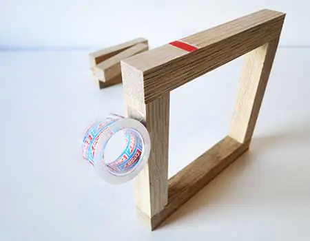 Umwickeln Sie die Ecken mit dem Klebeband, um diese aneinander zu pressen, bis der Leim vollständig ausgehärtet ist. Das dauert ca. 1 Stunde. Anschließend können Sie die übrigen 4 Leisten zwischen die beiden Rahmen anbringen, sodass diese einen Würfel bilden. Lassen Sie die verleimten Leisten erneut aushärten. Auch hier verwenden Sie am besten Klebeband zum Fixieren der verleimten Holzleisten.