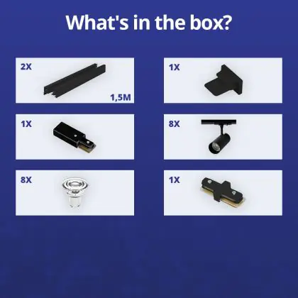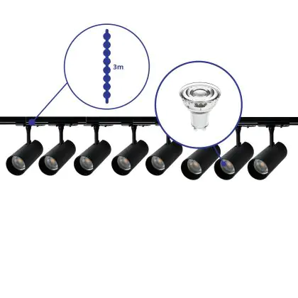 Beschreibung Bright Choice Komplettset 1-Phasen Rail 3 Meter Schwarz | incl. 8x Spot + GU10 2700K 3W Dimmbar + Abschlusskappe, Stromanschluss und I-Verbinder