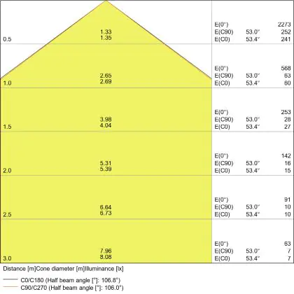 Der Abstrahlwinkel bezeichnet den Winkel, in dem das Licht aus der Lichtquelle ausgestrahlt wird. Er wird in Grad (D) angegeben. Je geringer die Gradzahl des Abstrahlwinkels ist, desto kleiner ist auch der Durchmesser des Lichtkegels, den die Lichtquelle produziert. Beispiel: Wird eine Lampe mit einem Abstrahlwinkel von 60 Grad an der Decke (2,5 m Höhe) angebracht, erzeugt sie einen Lichtkegel von 2,9 Metern Durchmesser. Hat die Lampe hingegen einen Abstrahlwinkel von 120 Grad, beträgt der Lichtkegel 8,7 Meter im Durchmesser. |
