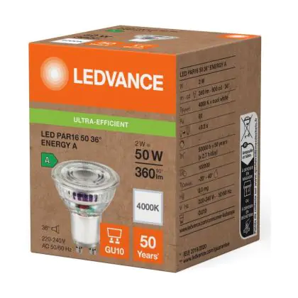Die Ledvance LED PAR16 GU10 Reflektor 2W 360lm 36D - 840 Kaltweiß | Ersatz Für 50W ist eine effiziente GU10 LED-Lampe und der perfekte Ersatz für Ihre konventionelle Halogenlampe mit 50W und einem GU10-Sockel, bei welchem die zwei Stifte einen Abstand von 10 mm zueinander haben. Zudem strahlt das Produkt Licht in der Farbtemperatur 4000K - Kaltweiß aus und punktet durch eine lange Lebensdauer.
