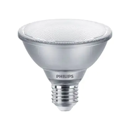 Der Mehrfachpackung 6x Philips Master Value LED Glühbirne Reflektor E27 PAR30 9.5W 760lm 25D - 930 Warmweiß | Höchste Farbwiedergabe - Dimmbar - Ersatz Für 75W ist ein leistungsstarker LED-Strahler mit E27-Sockel. Er kommt mit einer hohen Lebensdauer von 25000 Stunden daher und spart Ihnen somit nicht nur Energie-, sondern auch Austausch- und Wartungskosten. Im Preis ist zudem eine All-In-Garantie von 5 Jahre enthalten.